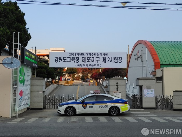 [동해=뉴스핌] 이형섭 기자 = 2022학년도 대학수학능력시험이 치러지는 강원 동해시 북평여자고등학교 정문 앞에서 긴급 상황에 대비하는 동해경찰. 2021.11.18 onemoregive@newspim.com
