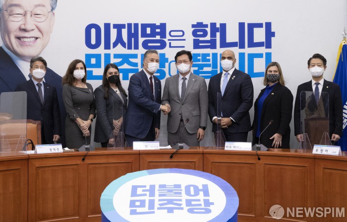 [서울=뉴스핌] 최상수 기자 = 송영길 더불어민주당 대표(오른쪽 넷째)가 23일 오후 국회 당대표회의실에서 미국 연방하원의원 대표단과 접견에 앞서 마크 타카노 보훈위원장 등과 기념촬영을 하고 있다. 2021.11.23 kilroy023@newspim.com