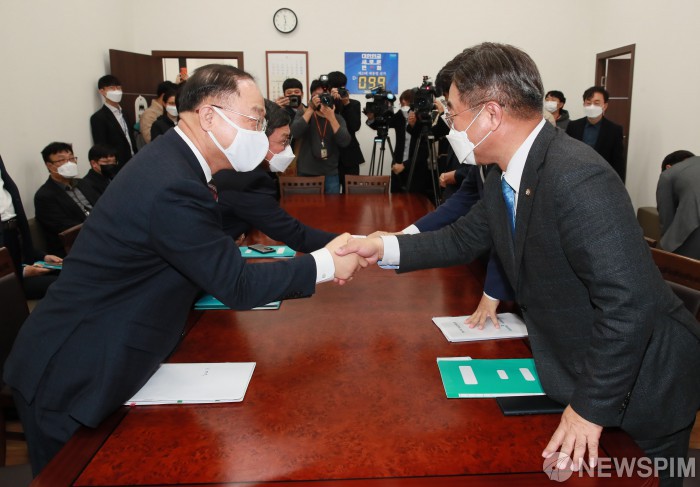 [서울=뉴스핌] 이형석 기자 = 윤호중 더불어민주당 원내대표(오른쪽)와 홍남기 부총리 겸 기획재정부 장관이 30일 서울 여의도 국회에서 예산협의를 시작하며 악수하고 있다. 2021.11.30 leehs@newspim.com