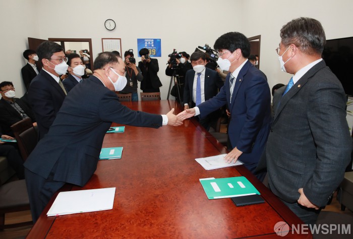 [서울=뉴스핌] 이형석 기자 = 홍남기 부총리 겸 기획재정부 장관(왼쪽)과 박완주 더불어민주당 정책위의장이 30일 서울 여의도 국회에서 예산협의에 앞서 악수하고 있다. 2021.11.30 leehs@newspim.com