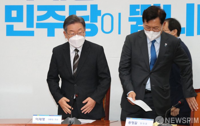 [서울=뉴스핌] 이형석 기자 = 이재명 더불어민주당 대선후보와 송영길 대표가 1일 오후 서울 여의도 국회에서 열린 코로나 대책을 위한 긴급회의에 참석하고 있다. 2021.12.01 leehs@newspim.com