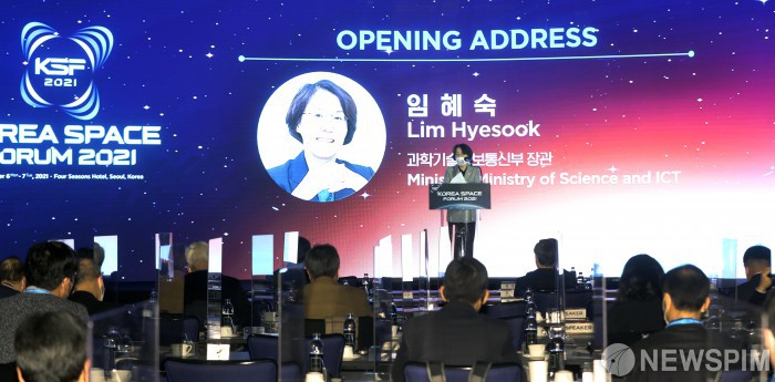 [서울=뉴스핌] 김민지 인턴기자 = 임혜숙 과학기술정보통신부 장관이 6일 오전 서울 종로구 포시즌스호텔에서 열린 2021 코리아 스페이스 포럼에서 개회사하고 있다. 2021.12.06 kimkim@newspim.com