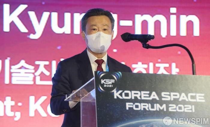 [서울=뉴스핌] 김민지 인턴기자 = 송경민 한국우주기술진흥협회장이 6일 오전 서울 종로구 포시즌스호텔에서 열린 2021 코리아 스페이스 포럼에서 환영사하고 있다. 2021.12.06 kimkim@newspim.com