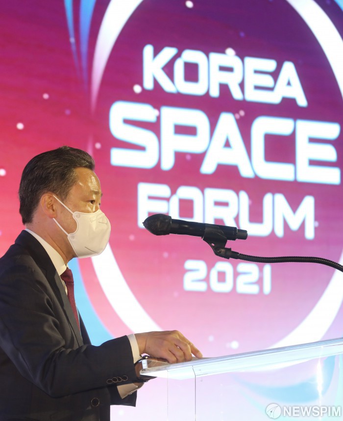 [서울=뉴스핌] 김민지 인턴기자 = 송경민 한국우주기술진흥협회장이 6일 오전 서울 종로구 포시즌스호텔에서 열린 2021 코리아 스페이스 포럼에서 환영사하고 있다. 2021.12.06 kimkim@newspim.com