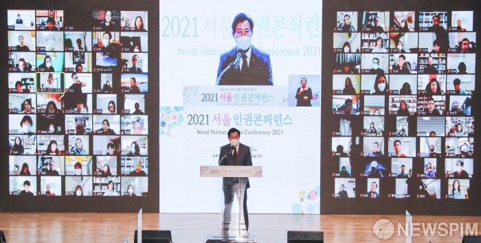 [서울=뉴스핌] 황준선 인턴기자 = 오세훈 서울시장이 6일 오후 서울 중구 서울시청에서 열린 2021 서울 인권콘퍼런스 개회식에서 환영사를 하고 있다. 2021.12.06 hwang@newspim.com