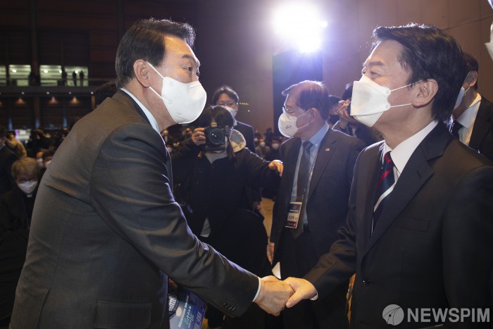 [서울=뉴스핌] 국회사진취재단 = 윤석열 국민의힘 대선후보와 안철수 국민의당 대선 후보가 10일 오후 서울 강남 코엑스 전시장 D홀에서 열린 ‘<우리의 희망! 복지강국!>사회복지 비전선포대회’에서 악수를 하고 있다. 2021.12.10 photo@newspim.com