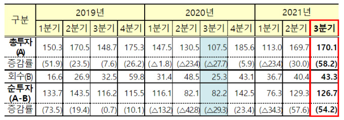전년동기 투자액은 금융보험업(84.6%), 제조업(7.3%), 부동산업(347.7%), 정보통신업(117.7%) 등에서 증가했으나 도소매업은 큰 폭 감소(-32.0%)했다.