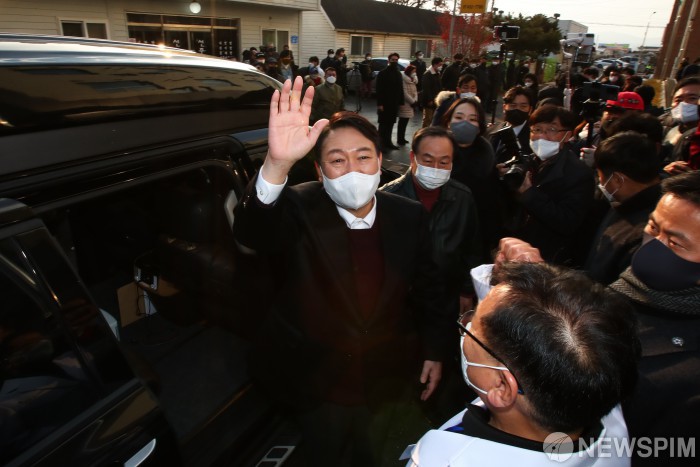 [철원=뉴스핌] 국회사진취재단 = 국민의힘 윤석열 대선 후보가 20일 철원군 갈말읍 공공 산후조리원을 방문해 둘러본 뒤 차량에 탑승하기 전 지지자들에게 인사하고 있다. 2021.12.20 photo@newspim.com
