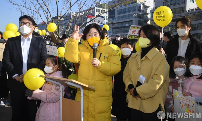 [서울=뉴스핌] 국회사진취재단 = 심상정 정의당 대선후보가 7일 서울 구로구 항동 수직구 공사현장을 방문해 주민들과 간담회를 갖고 있다. 2022.01.07 photo@newspim.com