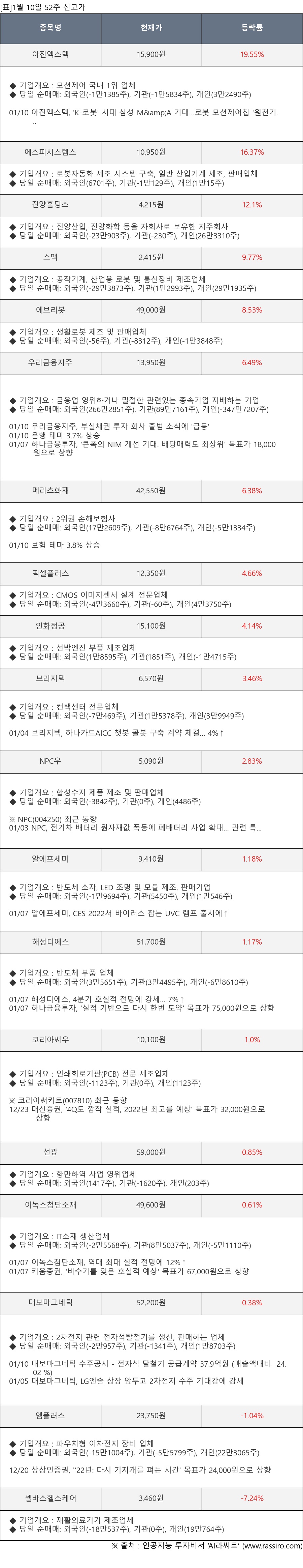 ※ 관련 종목: 아진엑스텍, 에스피시스템스, 진양홀딩스, 스맥, 에브리봇, 우리금융지주, 메리츠화재, 픽셀플러스, 인화정공, 브리지텍, NPC우, 알에프세미, 해성디에스, 코리아써우, 선광, 이녹스첨단소재, 대보마그네틱, 엠플러스, 셀바스헬스케어