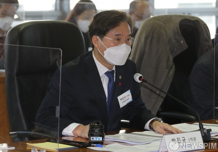 [서울=뉴스핌] 황준선 기자 = 박진규 산업통상자원부 1차관이 13일 오후 서울 서초구 코트라에서 열린 복지부·산업부 공동 주재 백신·원부자재 기업투자 촉진회의에서 모두발언을 하고 있다. 2022.01.13 hwang@newspim.com