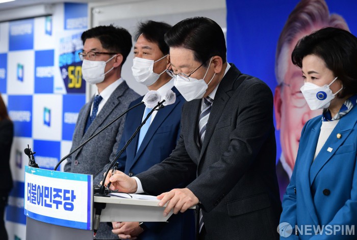 [서울=뉴스핌] 이형석 기자 = 이재명 더불어민주당 대선후보가 18일 서울 여의도 민주당사에서 일자리 대전환 6대 공약을 발표한 뒤 취재진의 질의를 메모하고 있다. 2022.01.18 leehs@newspim.com