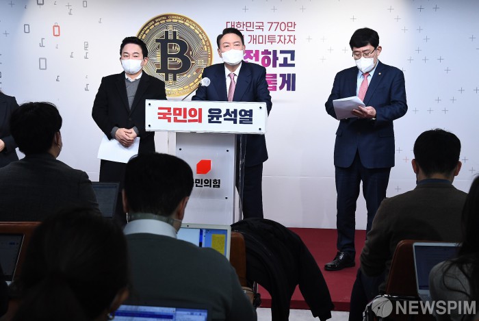 [서울=뉴스핌] 이형석 기자 = 윤석열 국민의힘 대선 후보가 19일 서울 여의도 중앙 당사에서 ‘가상자산 개미투자자 안심투자’에 대한 공약을 발표하고 있다. 2022.01.19 leehs@newspim.com