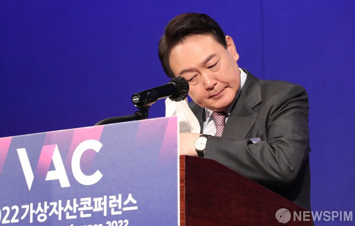 [서울=뉴스핌] 국회사진취재단 = 윤석열 국민의힘 대선후보가 20일 서울 중구 조선호텔 그랜드볼룸에서 열린 "혁신, 도전, 미래" 2022 가상자산 컨퍼런스에 참석, 축사에 앞서 마스크를 벗고 있다. 2022.01.20 photo@newspim.com