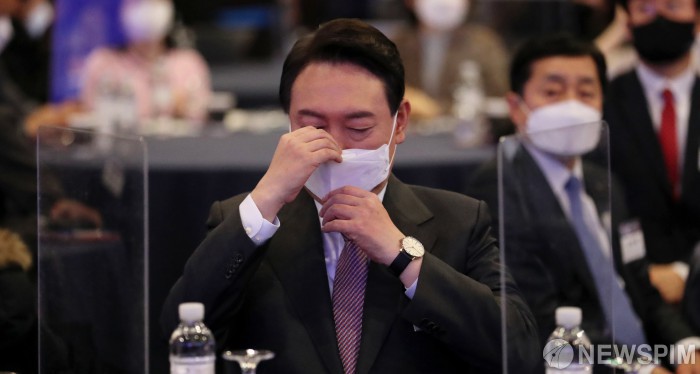 [서울=뉴스핌] 국회사진취재단 = 윤석열 국민의힘 대선후보가 20일 서울 중구 조선호텔 그랜드볼룸에서 열린 "혁신, 도전, 미래" 2022 가상자산 컨퍼런스에 참석, 마스크를 고쳐쓰고 있다. 2022.01.20 photo@newspim.com