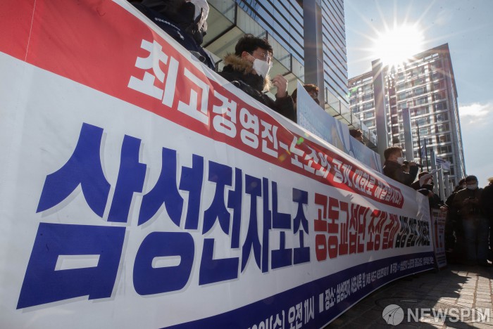 [서울=뉴스핌] 윤창빈 기자 = 삼성전자 노동조합 공동교섭단 조합원들이 16일 오전 서울 서초구 삼성전자 서초사옥 앞에서 열린 삼성전자노조 공동교섭단 조정 결과 입장 발표 기자회견에서 구호를 외치고 있다. 2022.02.16 pangbin@newspim.com