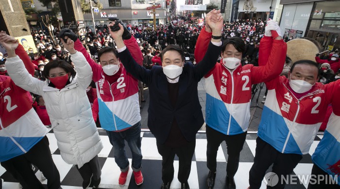 [청주=뉴스핌] 이형석 기자 = 윤석열 국민의힘 대선후보가 16일 오후 충북 청주시 상당구 성안로에서 열린 충북권 유세에서 선거관계자들과 손을 들고 지지자들의 환호에 답을 하고 있다. 2022.02.16 leehs@newspim.com