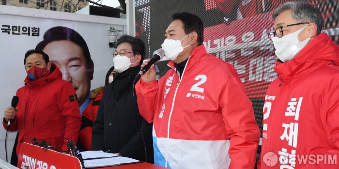 [서울=뉴스핌] 국회사진취재단 = 윤석열 국민의힘 후보가 17일 서울 종로구 동묘앞거리에서 유승민 전 의원, 종로 보궐선거에 출마한 최재형 전 감사원장과 지지를 호소하고 있다. 2022.02.17 photo@newspim.com