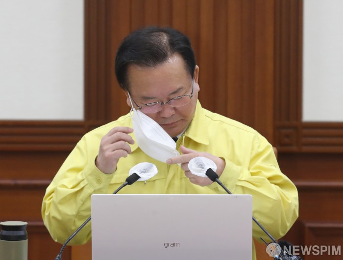 [서울=뉴스핌] 김학선 기자 = 김부겸 국무총리가 18일 서울 종로구 정부서울청사에서 열린 코로나19 대응 중앙재난안전대책본부 회의에 참석해 모두발언에 앞서 마스크를 벗고 있다. 2022.02.18 yooksa@newspim.com