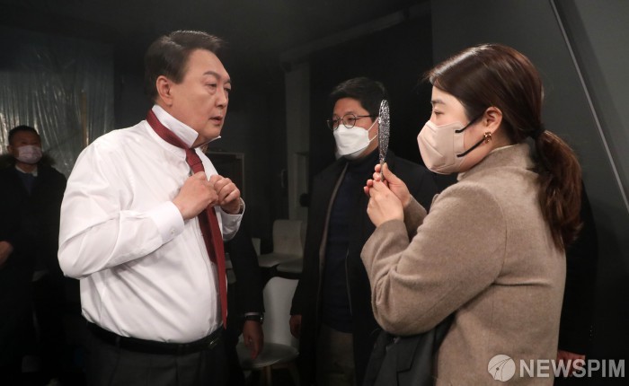 [서울=뉴스핌] 국회사진취재단 = 방송 광고촬영과 토론준비로 공개일정을 잡지 않은 윤석열 국민의힘 대선 후보가 20일 서울 중구의 한 방송사 스튜디오에서 광고 촬영을 준비하고 있다. 2022.02.20 photo@newspim.com