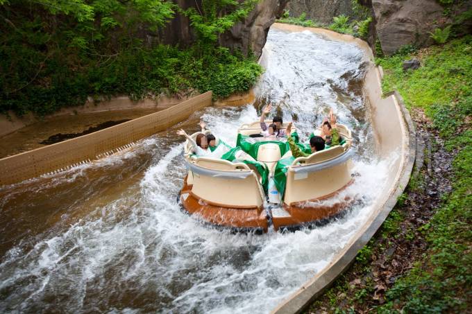 썬더폴스는 보트를 타고 수로를 이동하며 급류타기와 급강하를 즐길 수 있는 래프팅 어트랙션이다.