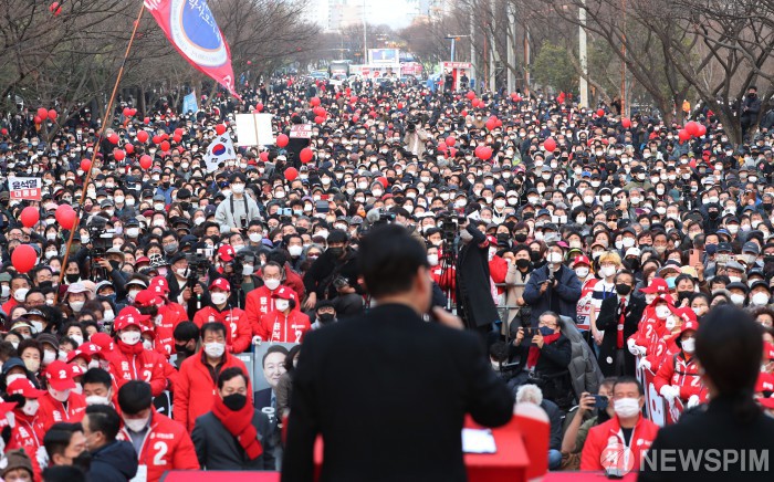 [대구=뉴스핌] 최상수 기자 = 윤석열 국민의힘 대선후보가 4일 오후 대구 달서구 두류공원에서 열린 '대구시민 여러분, 감사합니다. 사랑합니다.' 유세에서 지지연설을 하고 있다. 2022.03.04 kilroy023@newspim.com