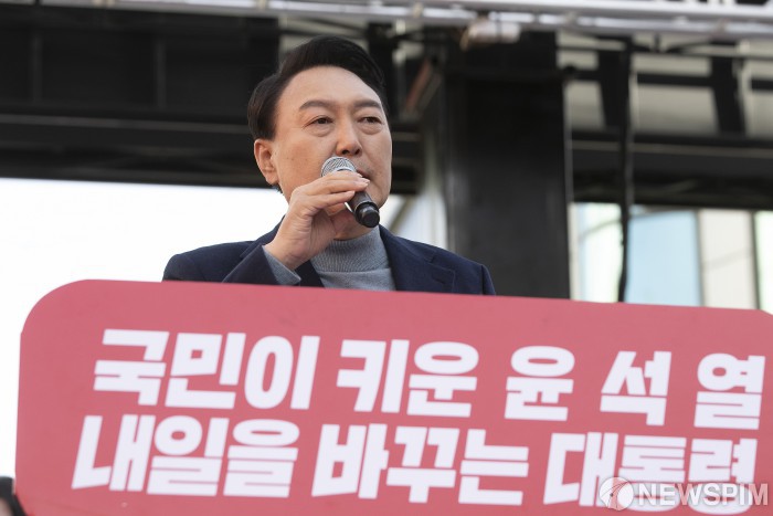 [제천=뉴스핌] 최상수 기자 = 윤석열 국민의힘 대선후보가 5일 오전 충북 제천시 제천문화의거리에서 '의병의 고장 제천, 투표로 나라를 지킨다' 유세를 하고 있다. 2022.03.05 kilroy023@newspim.com