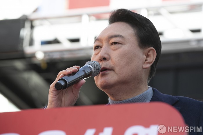 [제천=뉴스핌] 최상수 기자 = 윤석열 국민의힘 대선후보가 5일 오전 충북 제천시 제천문화의거리에서 '의병의 고장 제천, 투표로 나라를 지킨다' 유세를 하고 있다. 2022.03.05 kilroy023@newspim.com