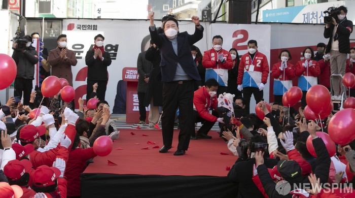 [제천=뉴스핌] 최상수 기자 = 윤석열 국민의힘 대선후보가 5일 오전 충북 제천시 제천문화의거리에서 열린 '의병의 고장 제천, 투표로 나라를 지킨다' 유세에서 어퍼컷 세레머니를 하고 있다. 2022.03.05 kilroy023@newspim.com