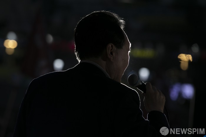 [평택=뉴스핌] 국회사진취재단 = 윤석열 국민의힘 대선후보가 7일 저녁 경기 평택역 앞에서 열린 유세에서 발언을 하고 있다. 2022.03.07 photo@newspim.com