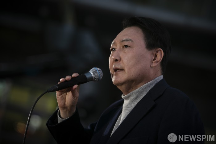 [평택=뉴스핌] 국회사진취재단 = 윤석열 국민의힘 대선후보가 7일 저녁 경기 평택역 앞에서 열린 유세에서 발언을 하고 있다. 2022.03.07 photo@newspim.com