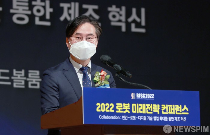 [서울=뉴스핌] 박진규 산업통상자원부 1차관이 22일 오전 서울 강남구 코엑스 그랜드볼룸에서 열린 2022 로봇 미래전략 콘퍼런스에서 축사하고 있다. [사진=산업통상자원부] 2022.03.22 photo@newspim.com