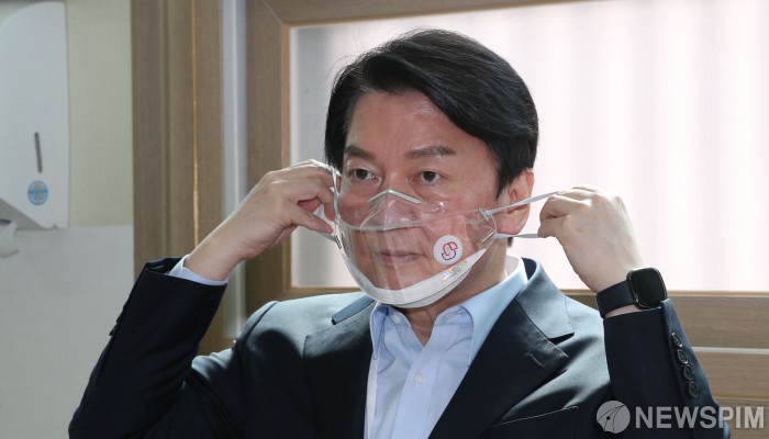 [서울=뉴스핌] 인수위사진기자단 = 7일 안철수 대통령직인수위원장이 아이들 언어교육 발달을 위해 입모양을 볼수 있는 투명마스크를 활용하고 있는 서울 종로구 사직어린이집을 방문해 마스크를 사용해 보고 있다. 2022.04.07 photo@newspim.com