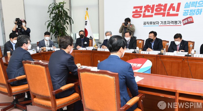 [서울=뉴스핌] 최상수 기자 = 국민의힘 지방선거 출마자에 대한 면접이 8일 국회에서 열린 가운데 경기지사에 공천 신청한 5명중 2조 면접에 해당하는 유승민. 함경우 전 의원 천강정 후보자(왼쪽부터 뒷모습)가 면접을 하고 있다. 2022.04.08 kilroy023@newspim.com
