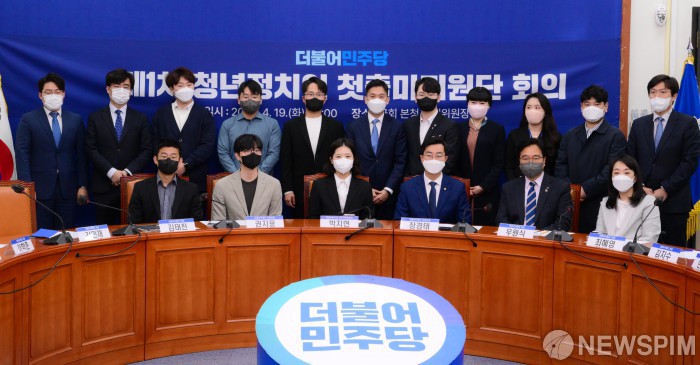[서울=뉴스핌] 이형석 기자 = 박지현 더불어민주당 공동비상대책위원장을 비롯한 참석자들이 19일 오전 서울 여의도 국회에서 열린 첫출마지원단회의에 앞서 기념촬영을 하고 있다. 2022.04.19 leehs@newspim.com