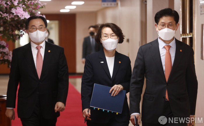 [서울=뉴스핌] 김민지 기자 = 19일 오전 서울 종로구 정부서울청사에서 문승욱 산업통상자원부 장관(왼쪽부터), 한경애 과학기술정보통신부 장관, 노형욱 국토교통부 장관이 국무회의에 참석하고 있다. 2022.4.19 kimkim@newspim.com