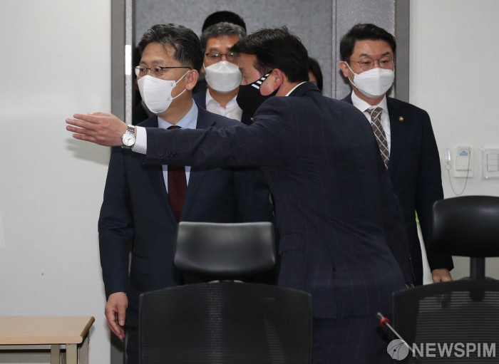[서울=뉴스핌] 최상수 기자 = 김현수(왼쪽) 농림축산식품부 장관과 이억원(맨 오른쪽) 기획재정부 1차관이 27일 오전 서울 여의도 국회 의원회관에서 열린 쌀 시장격리 당정협의에 참석하고 있다. 2022.04.27 kilroy023@newspim.com
