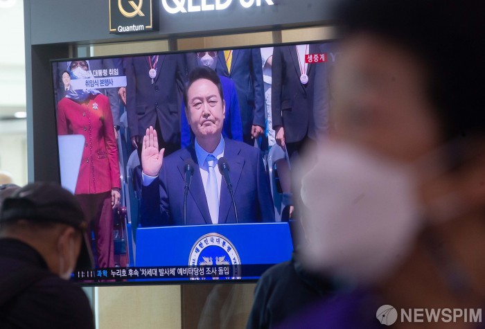 [서울=뉴스핌] 윤창빈 기자 = 10일 오전 서울 중구 서울역에서 시민들이 윤석열 대통령 취임식 생중계를 시청하고 있다. 2022.05.10 pangbin@newspim.com