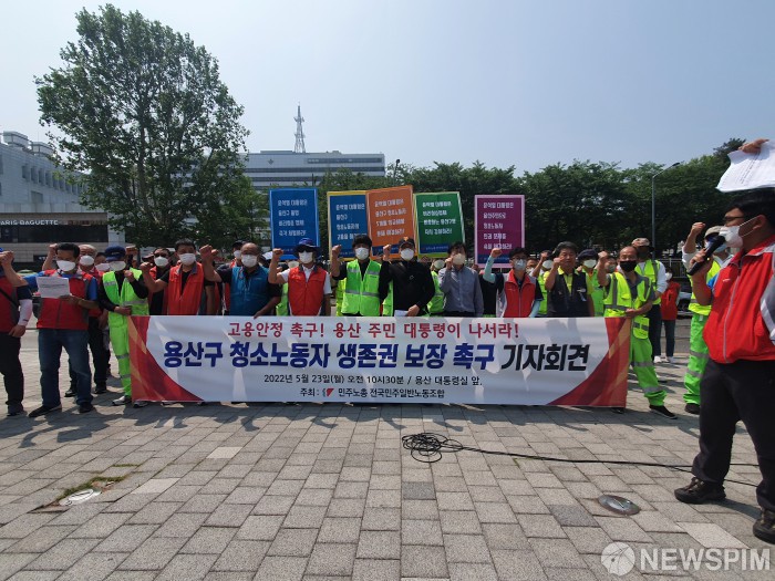 전날인 23일 민주노총 민주일반연맹 전국민주일반노동조합은 서울 용산구 대통령실 청사 인근에서 기자회견을 열고 "용산구 청소노동자 20명이 5개월째 급여를 받지 못해 용산구청으로부터 3억 원 정도의 임금체불이 지속되고 있다"며 "용산구청은 청소노동자들의 소속 문제와 임금체불 상태를 해소하라"고 주장했다.