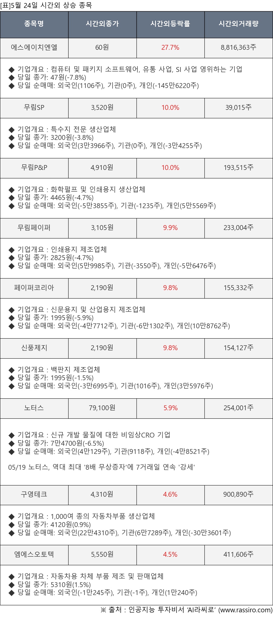 ※ 관련 종목: 에스에이치엔엘, 무림SP, 무림P&P, 무림페이퍼, 페이퍼코리아, 신풍제지, 노터스, 구영테크, 엠에스오토텍