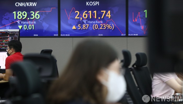 [서울=뉴스핌] 김민지 기자 = 코스피가 전 거래일(2605.87)보다 15.88포인트(0.61%) 오른 2621.75에 시작한 25일 오전 서울 중구 하나은행 딜링룸에 지수가 표시돼있다. 이날 코스닥은 869.19에, 원·달러환율은 1261.5원에 개장했다. 2022.05.25 kimkim@newspim.com