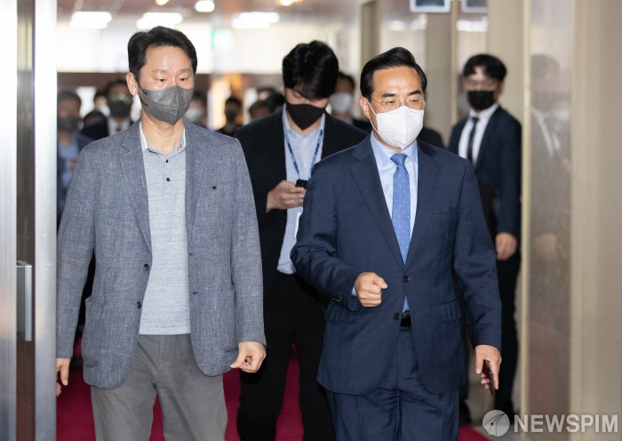 [서울=뉴스핌] 이형석 기자 = 박홍근 더불어민주당 원내대표(오른쪽)가 29일 오전 서울 여의도 국회에서 박병석 국회의장과 추경안 관련 회동을 마친 후 나서고 있다. 2022.05.29 leehs@newspim.com