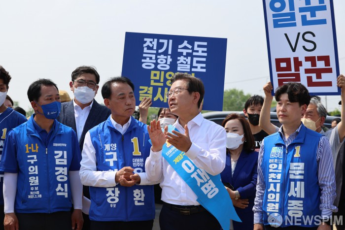 [인천=뉴스핌] 이형석 기자 = 이재명 더불어민주당 인천 계양을 국회의원 보궐선거 후보가 29일 인천 계양구 김포도시철도 기지창 인근에서 '지하철 9호선 계양 연장 공약'을 발표를 마친 후 윤환 인천 계양 구청장 후보와 이야기를 나누고 있다. 2022.05.29 leehs@newspim.com