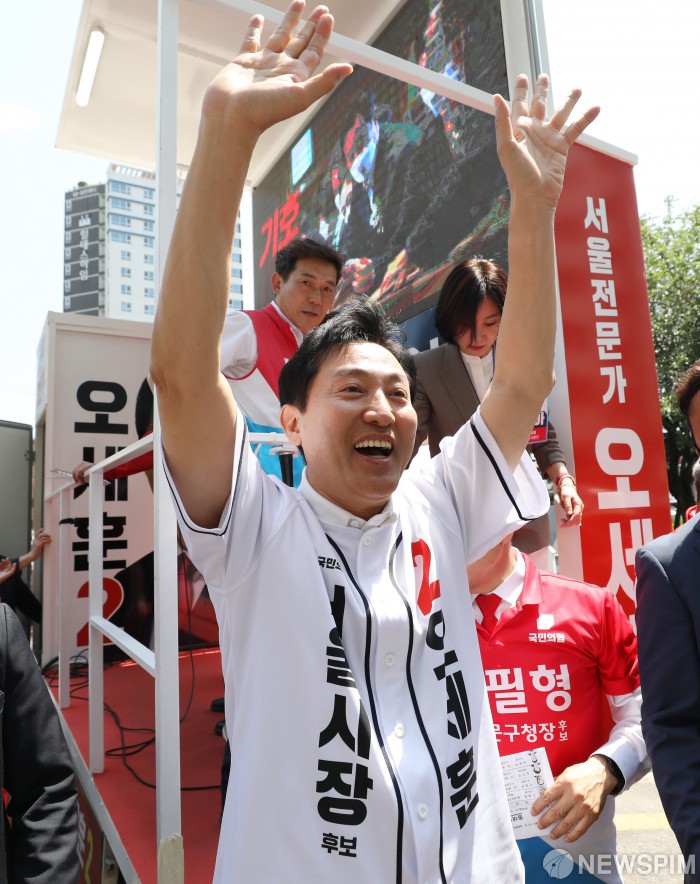 [서울=뉴스핌] 김민지 기자 = 오세훈 국민의힘 서울시장 후보가 31일 오후 서울 동대문구 장한평역에서 유세를 마치고 시민들을 향해 인사하고 있다. 2022.05.31 kimkim@newspim.com