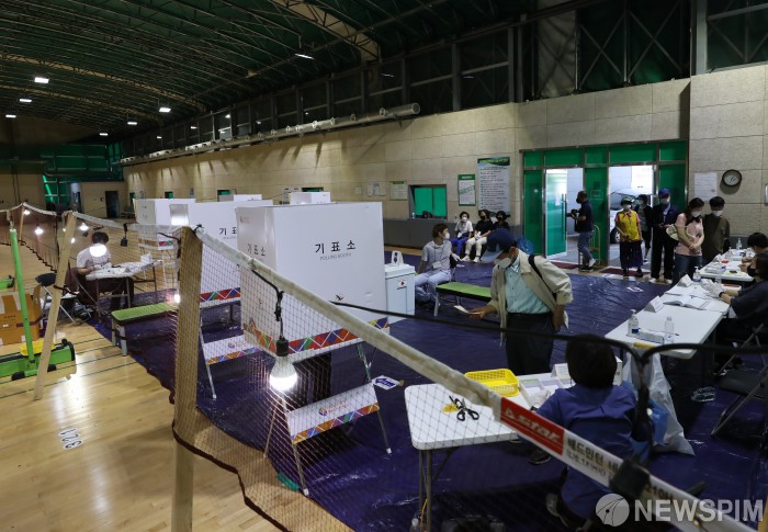 [서울=뉴스핌] 김민지 기자 = 제8회 전국동시지방선거일인 1일 오후 서울 서대문구 홍제배드민턴장에 마련된 투표소에서 시민들이 투표를 하고 있다. 일반 유권자 투표는 오후 6시까지, 코로나19 확진자의 경우 오후 6시 30분부터 7시 30분까지 할 수 있다. 2022.06.01 kimkim@newspim.com