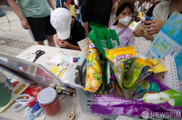 [서울=뉴스핌] 윤창빈 기자 = 12일 오후 서울 종로구 마로니에공원에서 열린 ‘2022 D. FESTA 대학로 거리공연 축제’를 찾은 아이들이 만들기 체험을 하고 있다. 2022.06.12 pangbin@newspim.com