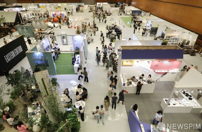 [서울=뉴스핌] 황준선 기자 = 22일 오후 서울 강남구 코엑스에서 개막한 '2022 더 메종'을 찾은 관람객들이 다양한 홈 데코 및 공간 인테리어 전시품들을 살펴보고 있다. 2022.06.22 hwang@newspim.com