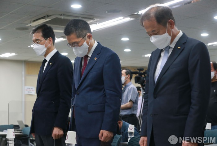 [서울=뉴스핌] 황준선 기자 = 이종엽 대한변호사협회 협회장(왼쪽부터), 이필수 대한의사협회 회장, 박태근 대한치과의사협회 회장이 7일 오후 서울 강남구 대한변호사협회에서 열린 '법조 및 의료인력 대상 테러행위 대응 대한변호사협회·대한의사협회·대한치과의사협회 공동 기자회견'에서 테러행위 피해자들에 대한 묵념을 하고 있다. 2022.07.07 hwang@newspim.com