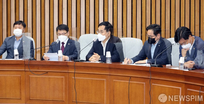[서울=뉴스핌] 최상수 기자 = 11일 서울 여의도 국회에서 열린 국민의힘 초선의원모임에서 최형두 의원(가운데)이 발언을 하고 있다. 2022.07.11 kilroy023@newspim.com