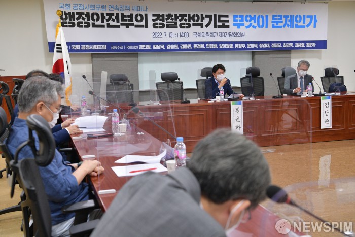 [서울=뉴스핌] 최상수 기자 = 13일 오후 서울 여의도 국회 의원회관에서 열린 '행정안전부의 경찰장악기도 무엇이 문제인가' 국회 공정사회포럼 연속정책 세미나에서 황운하 더불어민주당 의원이 인사말을 하고 있다. 2022.07.13 kilroy023@newspim.com